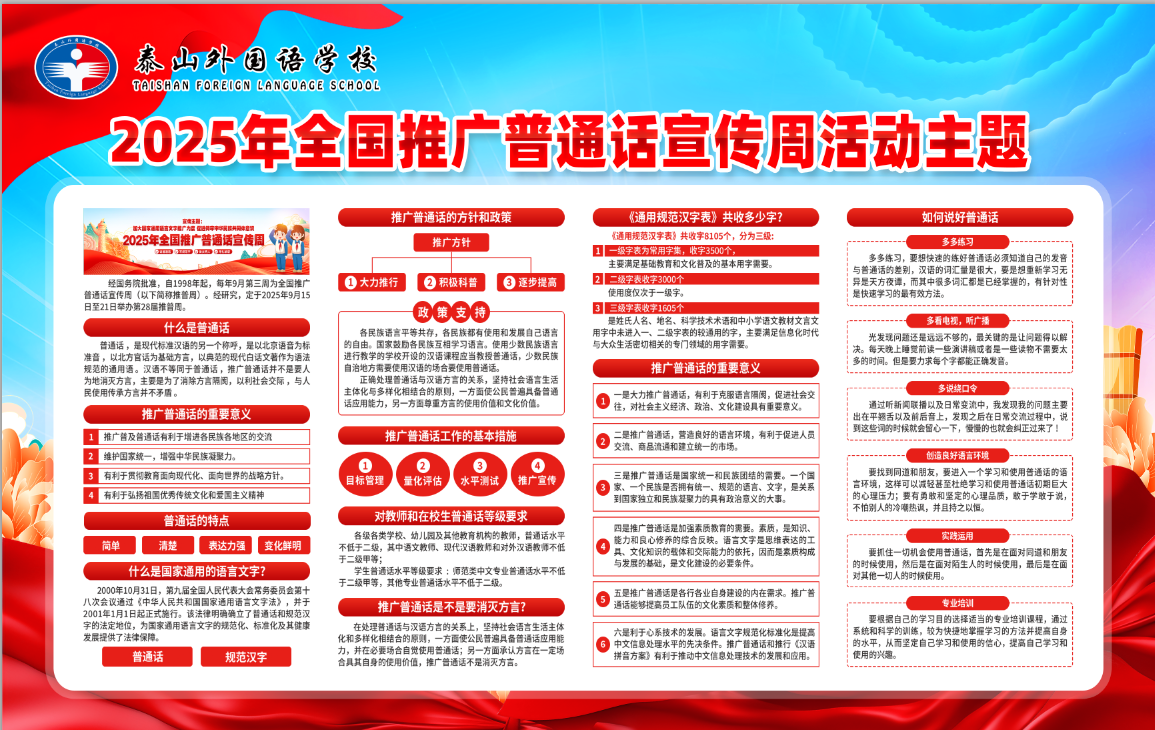 为深入贯彻落实国家语言文字工作方针,泰山外国语学校于近日成功举办了以“加大国家通用语言文字推广力度,促进铸牢中华民族共同体意识”为主题的第28届全国推广普通话宣传周系列活动。本次活动内容丰富、形式多样,在全校范围内营造了“说普通话、写规范字”的浓厚氛围。