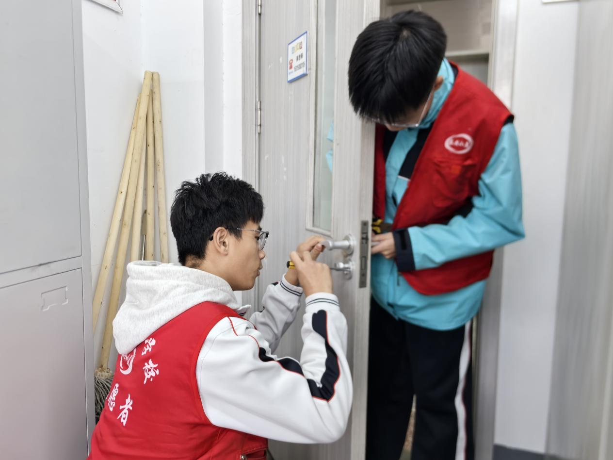 面对教室和办公室松动的门把手,他们仔细检查,用螺丝刀一一加固,让每一次开关门都恢复顺畅与安全。