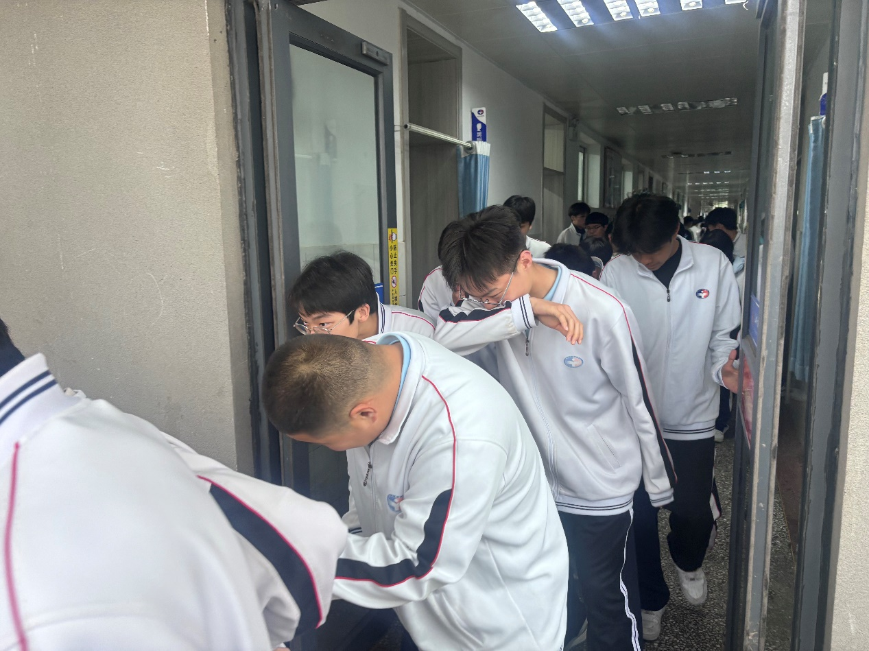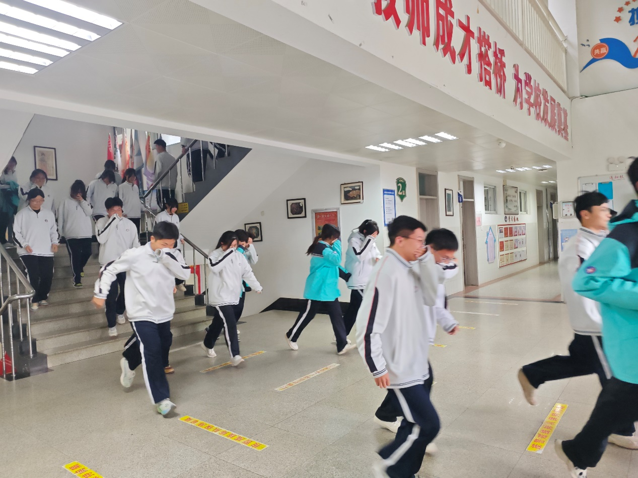 疏散引导组提前在教学楼各楼层楼梯口、拐角处就位,反复提醒“弯腰、捂鼻、靠右走,不推挤、不停留”。各班级按照预定路线有序下楼,走出教学楼后,在引导组指引下,同学们快速向楼下空地集合点行进,途中不得停留、聚集或擅自脱离队伍。