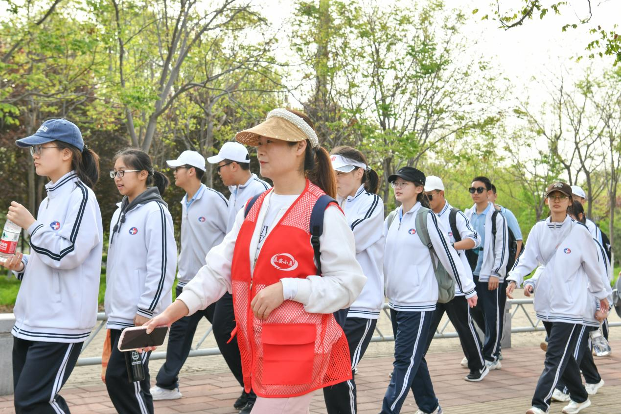 副校长宋玉成,校长助理、学工处主任王建中,校长助理、总务处主任曲斌,2021级级部主任张友强,2022级级部主任纪维镇始终伴随在学生行进队伍一侧,及时掌握学生身体状况,了解行进情况,对行进速度做出合理调整。