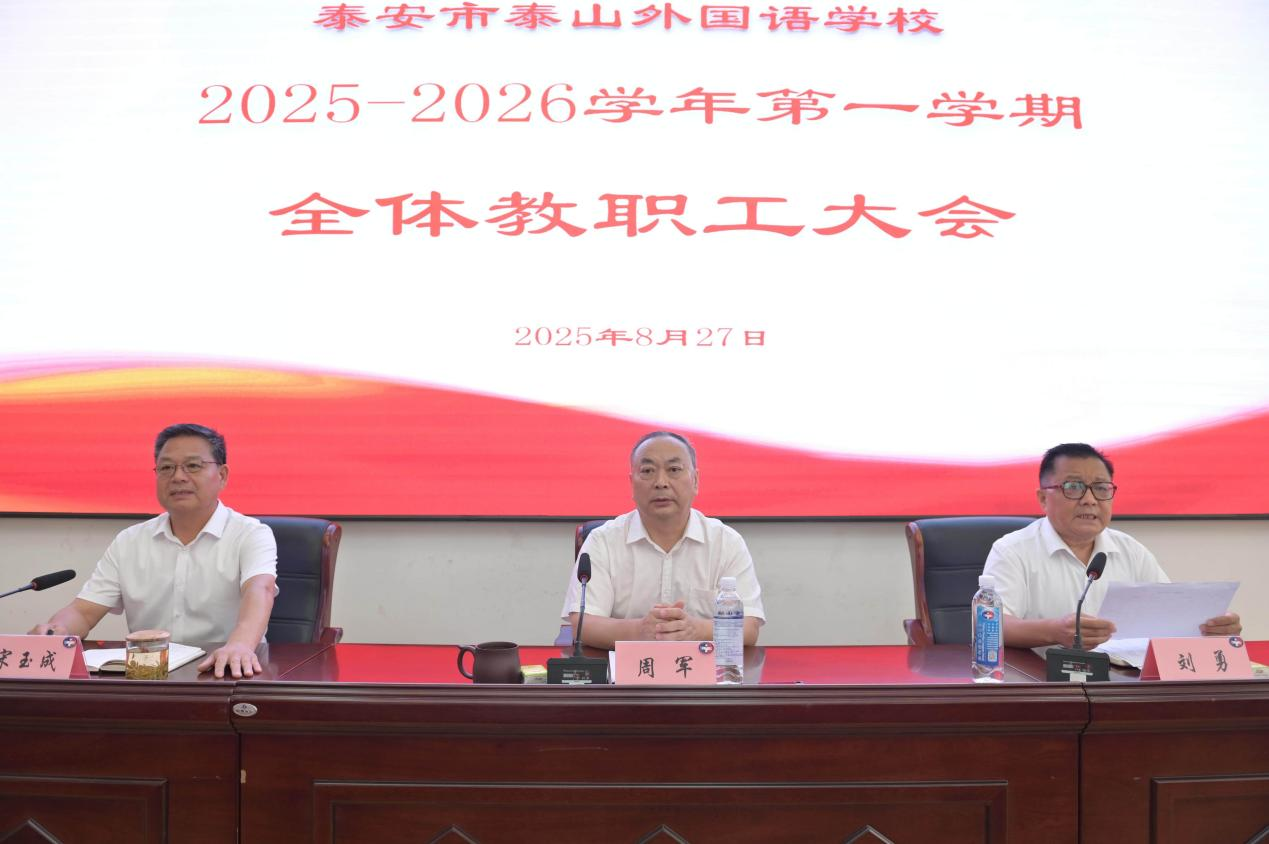 为进一步统一思想,明确目标,理清思路,凝聚共识,全面做好新学期的各项工作,8月27日上午,泰山外国语学校召开了全体教职工大会。全体教职工参加会议。