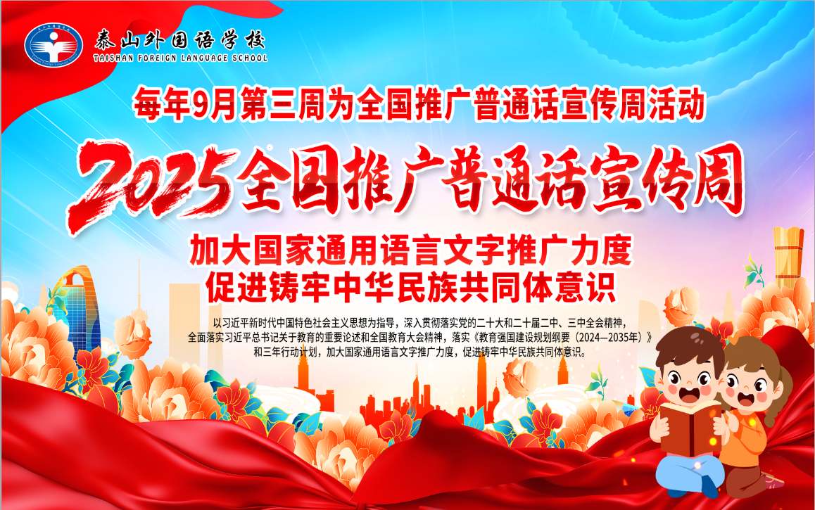 为深入贯彻落实国家语言文字工作方针,泰山外国语学校于近日成功举办了以“加大国家通用语言文字推广力度,促进铸牢中华民族共同体意识”为主题的第28届全国推广普通话宣传周系列活动。本次活动内容丰富、形式多样,在全校范围内营造了“说普通话、写规范字”的浓厚氛围。