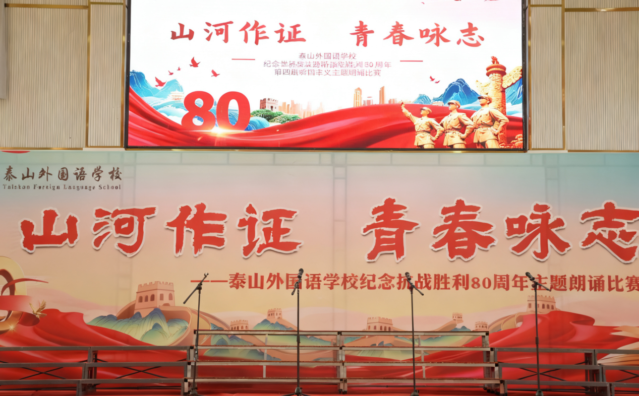 八十年岁月如歌,抗战精神历久弥新。在纪念中国人民抗日战争暨世界反法西斯战争胜利80周年的庄严时刻,为弘扬伟大抗战精神,落实立德树人根本任务,厚植青少年爱党爱国情怀,泰安市泰山外国语学校隆重举行“山河作证 青春咏志”主题朗诵比赛,以青春之声礼赞英雄史诗,用时代之音赓续红色血脉。