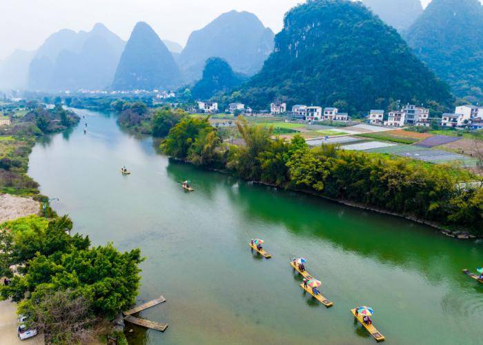 游客乘坐竹筏游览沿岸(an)风光。(无人机照片)CICPHOTO/黄胜林 摄(she)