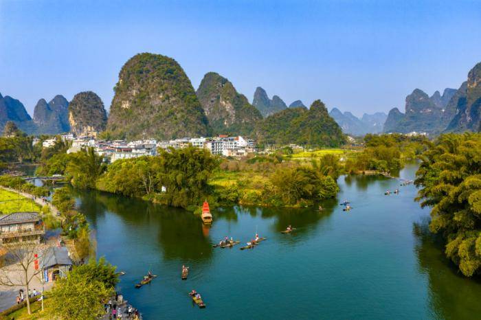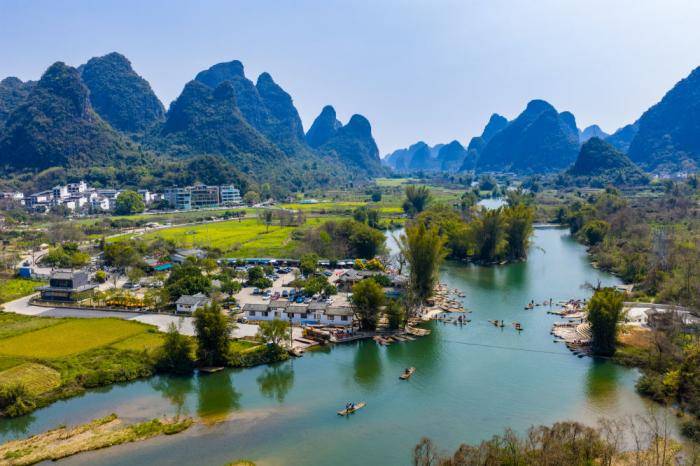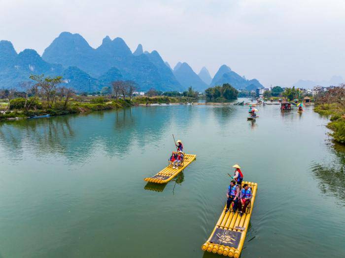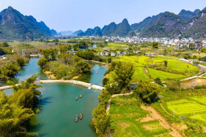 近日,广西桂林市阳朔县(xian)遇(yu)龙河景(jing)区,怒放的油菜花(hua)、弯曲的河流与苍翠的青(qing)山(shan)相映成景(jing),游客乘坐竹筏在遇(yu)龙河上嬉戏,欣赏喀斯特(te)山(shan)水之美。来源:中国(guo)图片集团(tuan)