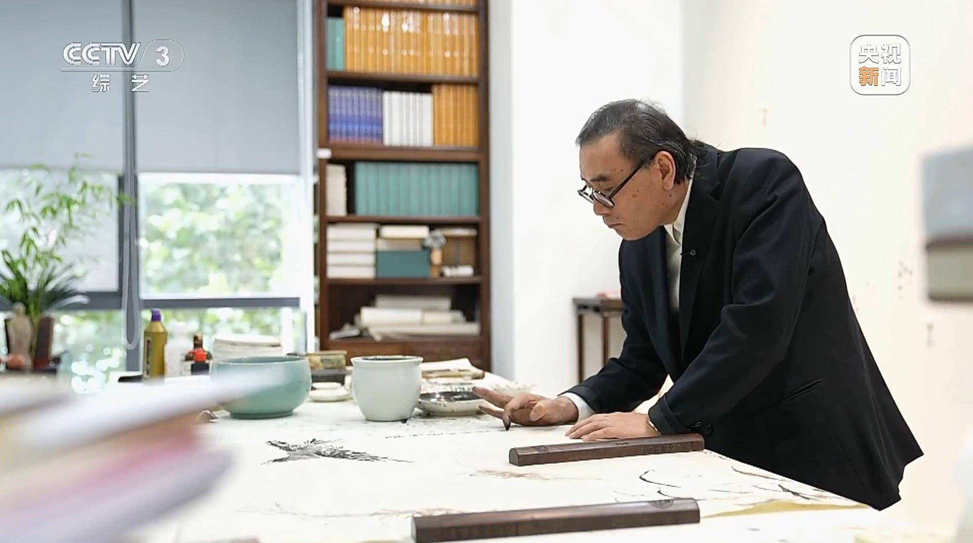 刘万鸣:比如说画(hua)草,画(hua)那种茅草,什么秋天的或者什么的,那我完(wan)全可以,可以用多(duo)指甲盖,可以用单,可以用多(duo)的,这有角度,利用了角度,这个(ge)手(shou)指也可以用,毛笔这样画(hua)不出来的,你看这种乱(luan)劲,你画(hua)不出来野的东西,你用毛笔是表达不出来的。