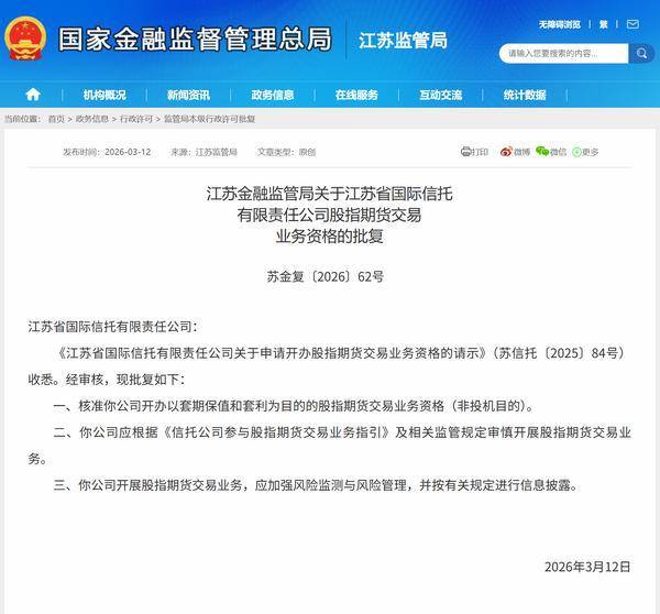 中国网财经3月20日讯 日前,江苏金(jin)融羁系局公布相干批复,核准江苏省国际信任无(wu)限责(ze)任公司(简称(cheng)“江苏信任”)开办以套期保值和套利为目的的股(gu)指期货生意营(ying)业营(ying)业资历(非谋利目的)。以下是相干批复正文(wen):