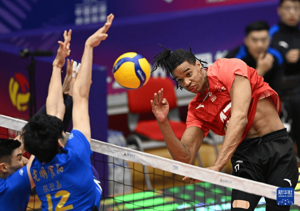3月19日,天(tian)津食物团(tuan)体队球员阿里汉(han)德罗(右)在(zai)比赛中扣球。